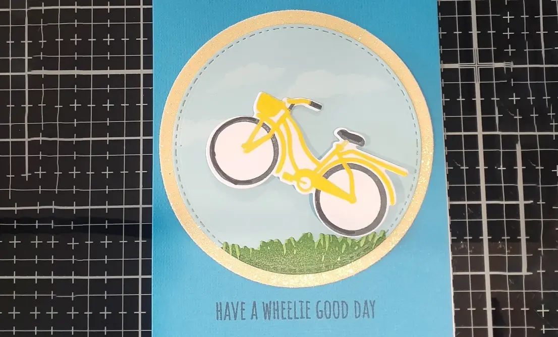 While looking at this kit, I wasn’t quite sure what to do with it. A lot of great stamps but I wasn’t sure what vibe to go with. I practiced just stamping out the bikes with the yellow and teal inks and thought, not too bad. I cut them out using the coordinating die included in the kit. Now I have a bunch of bikes. One bike was sitting on my desk in a slanted position, and it looked like it was doing a wheelie. I looked at the sentiments in the stamp set because I remembered there was a pun about wheelies. I then decided to stamp and cut the grass. I picked a light blue cardstock from my scrap bin and stamped white clouds from the kit then used the nestling circle dies and cut one circle out of the blue and a larger one out of the yellow glitter paper that came in an older kit. I like adding movement or dimension to cards when I can and couldn’t quite figure out how to make the bike move until I remembered that I bought some plastic springs at Hobby Lobby on clearance. I attached the spring to the back wheel and put the bike at an angle on the card and presto – the bike “moves”.