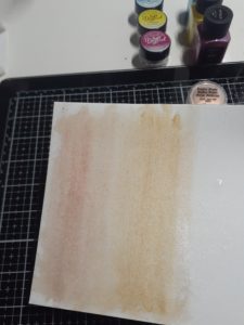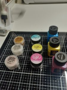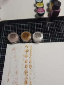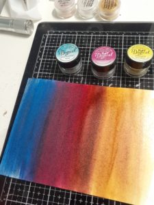 I started thinking about the background first. I wanted something more than just a basic ink blending. Not that there’s anything wrong with that – I have seen some beautiful ink blended backgrounds for this kit – I just wanted something different. So I thought I’d do a comparison of similar products: all mica powder based so you know they will have a lot of shimmery sparkles. The three products are: Ranger’s Perfect Pearls, Lindy’s Magical Powder and finally Arteza mica powders. (All three are linked below).