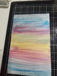 I started with the Perfect Pearls, I do not have many colors of these, so I used what I had. I used watercolor paper for this demonstration. I have done this same technique on 110# card stock with the same outcomes. I use a dry brush and just drop powder in lines.