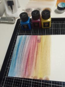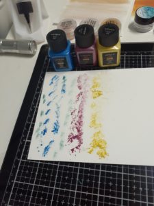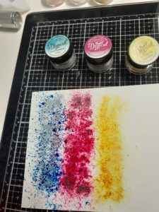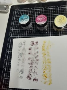 I started thinking about the background first. I wanted something more than just a basic ink blending. Not that there’s anything wrong with that – I have seen some beautiful ink blended backgrounds for this kit – I just wanted something different. So I thought I’d do a comparison of similar products: all mica powder based so you know they will have a lot of shimmery sparkles. The three products are: Ranger’s Perfect Pearls, Lindy’s Magical Powder and finally Arteza mica powders. (All three are linked below).