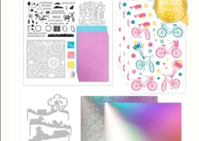 This month’s kit was all about springtime and the nostalgia of getting out and riding your bike. Growing up we rode our bikes EVERYWHERE! I remember having to go to volleyball practice my freshman year in high school, and my friend April came and “picked me up” on her bike. We rode the 2 miles to school with her on the seat and pedaling and me either sitting on the handlebars or standing on the back tire pegs. Ah, the good ole days!
