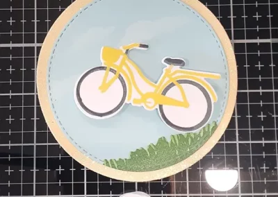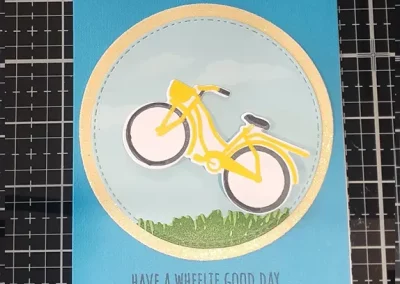 While looking at this kit, I wasn’t quite sure what to do with it. A lot of great stamps but I wasn’t sure what vibe to go with. I practiced just stamping out the bikes with the yellow and teal inks and thought, not too bad. I cut them out using the coordinating die included in the kit. Now I have a bunch of bikes. One bike was sitting on my desk in a slanted position, and it looked like it was doing a wheelie. I looked at the sentiments in the stamp set because I remembered there was a pun about wheelies. I then decided to stamp and cut the grass. I picked a light blue cardstock from my scrap bin and stamped white clouds from the kit then used the nestling circle dies and cut one circle out of the blue and a larger one out of the yellow glitter paper that came in an older kit. I like adding movement or dimension to cards when I can and couldn’t quite figure out how to make the bike move until I remembered that I bought some plastic springs at Hobby Lobby on clearance. I attached the spring to the back wheel and put the bike at an angle on the card and presto – the bike “moves”.