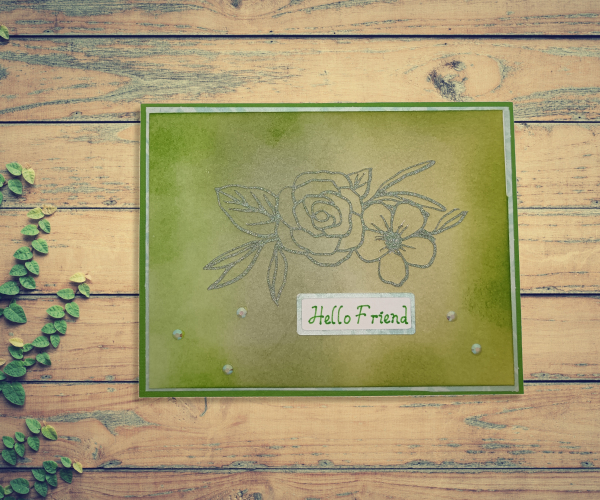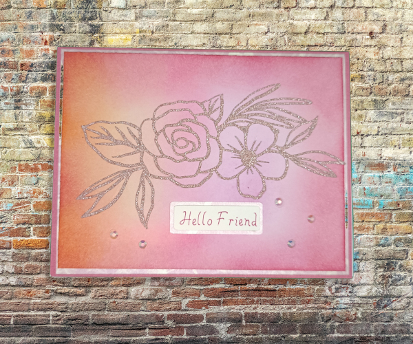 Glittery Hello Friend floral card made with individually inked backgrounds so each is a one of a kind. What a beautiful way to say Hello to your special friend. There is one of each color - pink or green